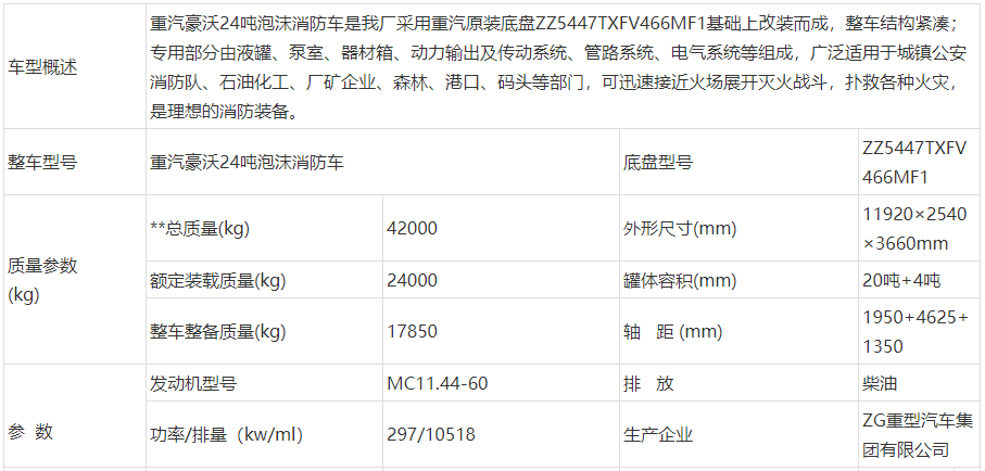 重汽豪沃24吨泡沫消防车是我厂采用重汽原装底盘ZZ5447TXFV466MF1基础上改装而成,整车结构紧凑;专用部分由液罐、泵室、器材箱、动力输出及传动系统、管路系统、电气系统等组成,广泛适用于城镇公安消防队、石油化工、厂矿企业、森林、港口、码头等部门,可迅速接近火场展开灭火战斗,扑救各种火灾,是理想的消防装备
