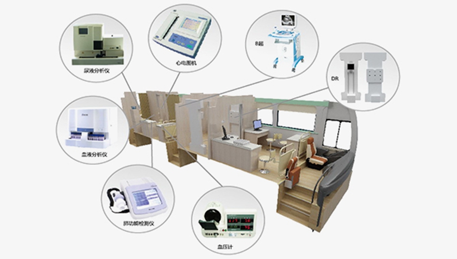 体检车内配置有线局域网和4G无线网络,可实现B超、心电图、DR、纯音电测听等体检结果数据自动汇总,打印报告;与站内互联,信息传回站内;自动上传云平台,实现远程会诊。