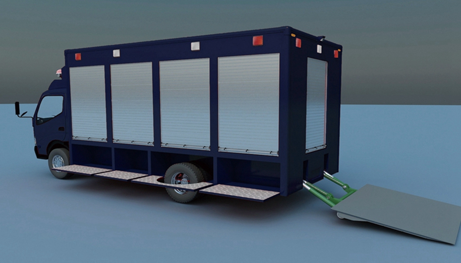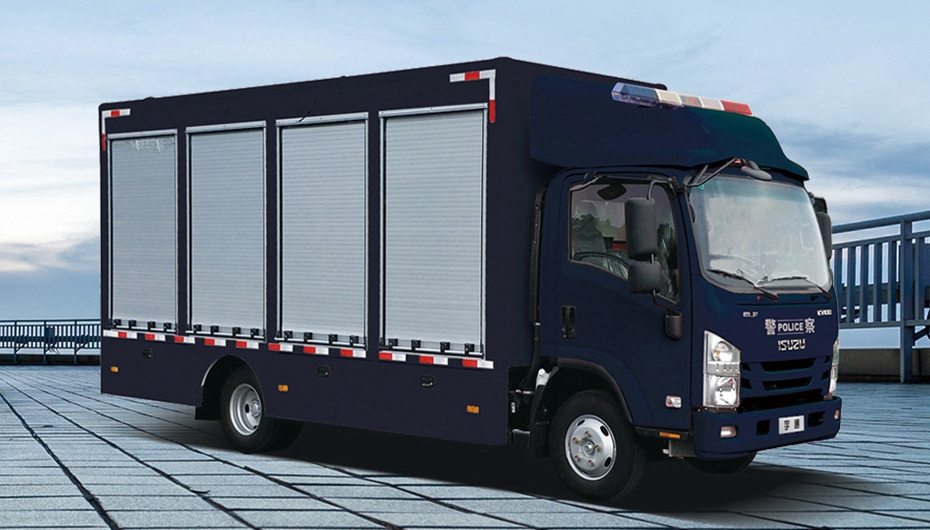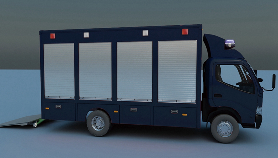 厢体两侧设置铝合金卷帘门及旋转踏步,厢体后部设置卷帘门和液压尾板,以方便在各方向上下车、存取物资。厢体内顶设置LED长条照明灯,厢体外部设置照明灯,方便夜间器材的运输、装卸车等。