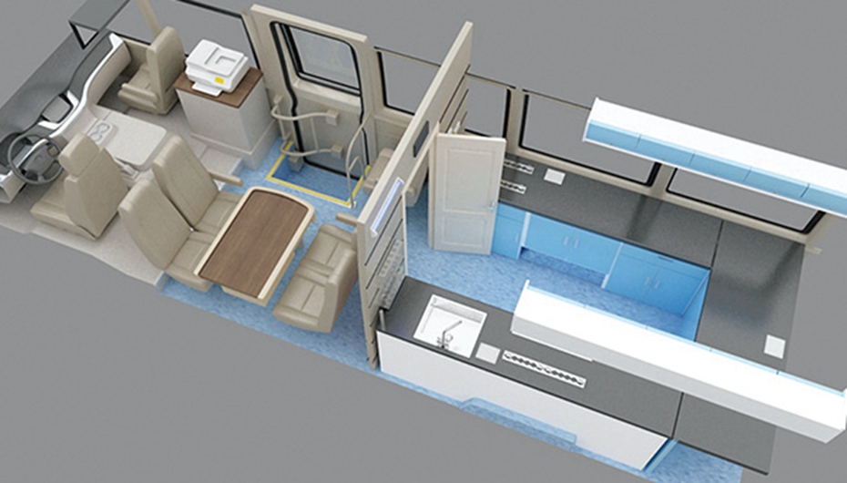 车辆采用分区布局设计,驾驶区、执法办公区、检测区设计合理。检测区根据定制化需求,设置有U形试验台、便携式勘查检测设备、插座、固定仪器滑轨、洗手池、污水箱、废液桶、设备存储柜、冰箱等设备。车外设置外显示器,可用于法制宣传。