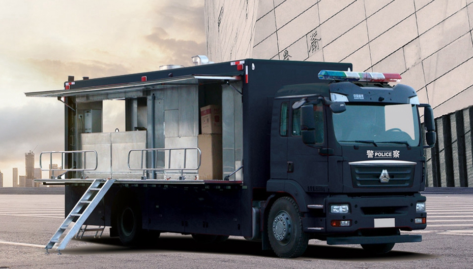 该车型选用汕德卡二类底盘改制,主要由底盘、舱体、炊事设施、水路系统、电气系统等组成,主要为野外执勤人员提供齐全的炊事设施,也可做电源车使用对外供电。采用重汽底盘,车速高、机动能力强、可靠性高