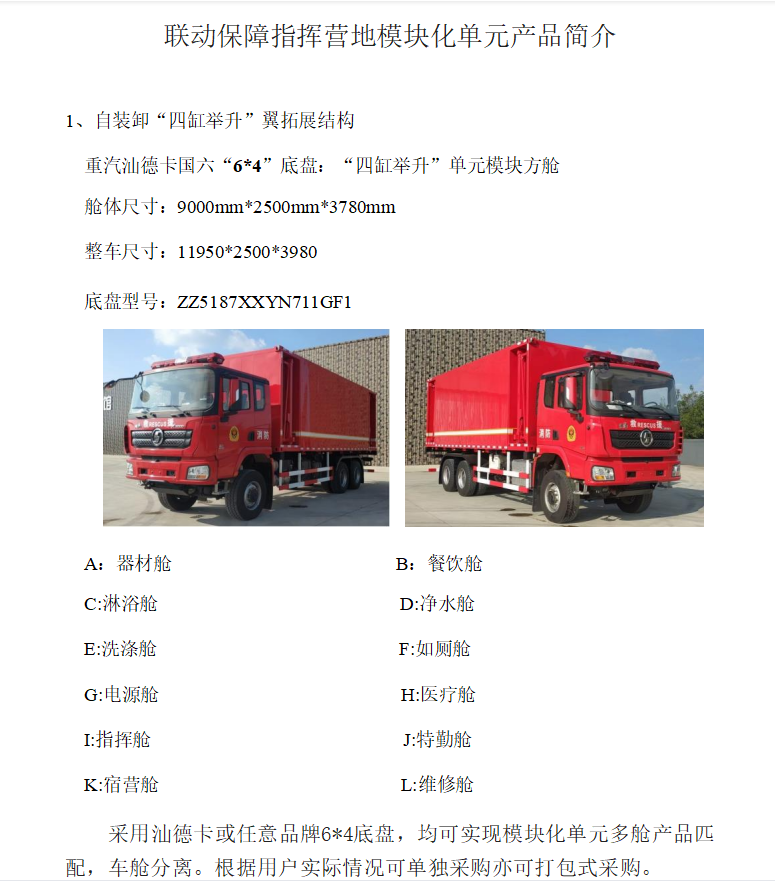 我公司自主研发“1+3+N”指挥方舱联动保障营地系列产品,体现 “全灾种、大应急”的救援需求,突出快速行动、高效专业救援、自 我保障能力等