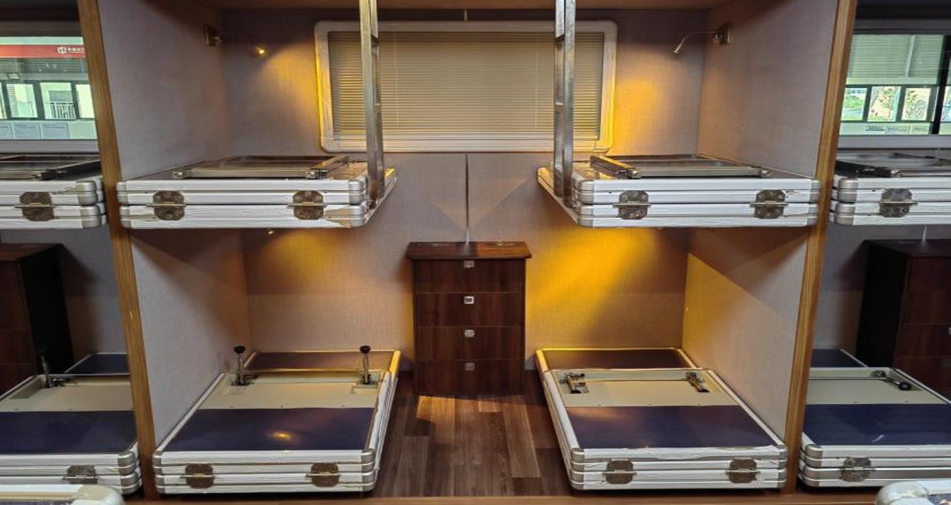 室内住宿设备为12组高低床,共可提供24人住宿。收拢状态下,床铺可折 叠,当箱体展开后可迅速翻转组合成12组高低床,组合时间不超过5分钟。 所有上下铺采用火车卧铺标准,上下床铺合理布置,每个床铺尺寸为长1850mm 宽600mm,床铺设置于方舱两侧且可翻转180°折叠,方舱中间为人行过道, 床铺完全展开后过道宽度0.6m