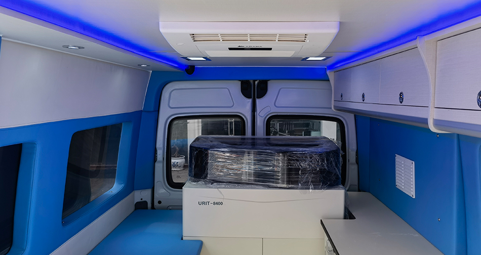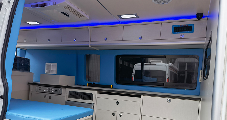 内饰均采用高分子环保材料,易清洁、消毒,有效保障车内卫生条件,同时地板采用重量轻、环保且可二次利用的装饰材料,便于工作人员的清洁、整理。