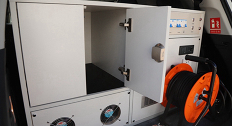 配置有配电集中控制箱 、充逆变一体机、服务电瓶、接地系统、电缆盘、车内电源插座 、车外电源防水接口 、操作台 、紫外消毒灯、灭火器设施。