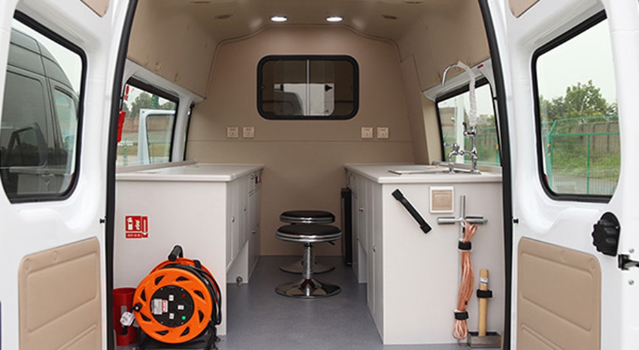 动物疫病现场快速检测车,配置齐全的供电、供水、换气、温度调节等设施,搭载荧光检测仪及配套试剂盒载等多种快检仪器,可快速进行动物疫病类检测。