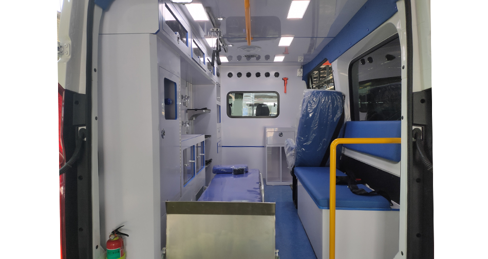 配备自动担架、铲式担架、悬挂式输液瓶夹持器等专业救护系统,操作简单且便于运输,同时采用铝合金材质,可辅助担架上车,并导向固定、防护地板,⽅便医护⼈员操作,有效缓解⼯作疲劳,提⾼救护效率。
