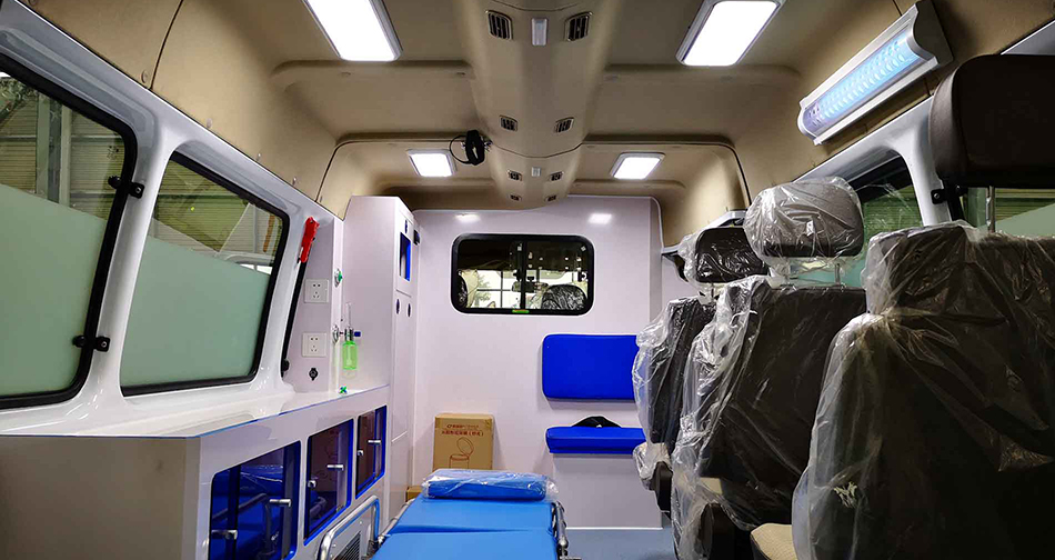 内饰均采用高分子环保材料,易清洁、消毒,有效保障车内卫生条件,提升病人运送过程中的安全性 ,同时地板采用重量轻、环保且可二次利用的装饰材料,便于医护人员的清洁、整理。