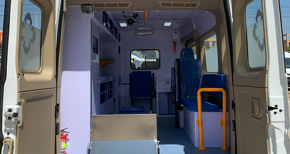 配备自动担架、铲式担架、悬挂式输液瓶夹持器等专业救护系统,操作简单且便于运输,同时采用铝合金材质,可辅助担架上车,并导向固定、防护地板。