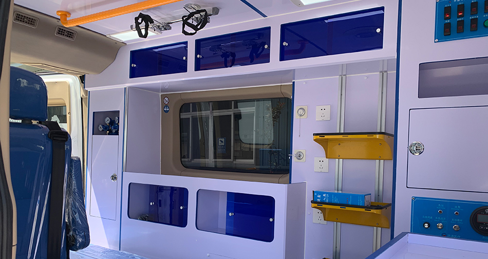 内饰均采用高分子环保材料,易清洁、消毒,有效保障车内卫生条件,提升病人运送过程中的安全性 ,同时地板采用重量轻、环保且可二次利用的装饰材料,便于医护人员的清洁、整理。
