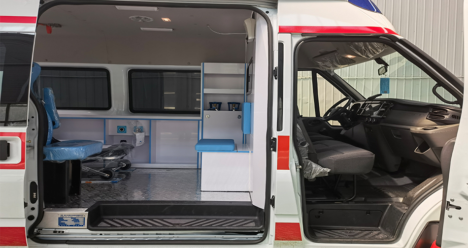 承载式高钢性车身,采用高强度镀锌板材,高钢性底盘一体铸造,安全性能等级高;车体分别设置单开门和双开门结构,方便人员进出和病患转移。