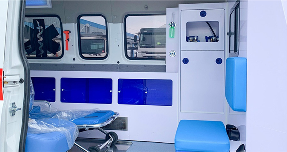 内饰均采用高分子环保材料,易清洁、消毒,有效保障车内卫生条件,提升病人运送过程中的安全性 ,同时地板采用重量轻、环保且可二次利用的装饰材料,便于医护人员的清洁、整理。